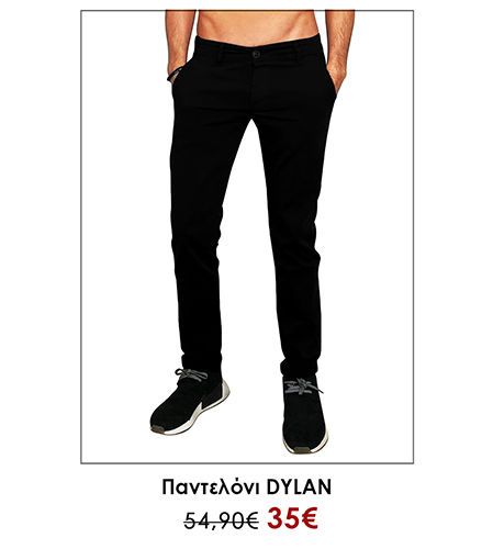 Chinos παντελόνιΑνδρικό CHINOS παντελόνι DYLANΤο chinos μαύρο παντελόνι αποτελεί αναμφισβήτητα το πιο διαχρονικό κομμάτι που πρέπει να υπάρχει στη ντουλάπα σου. Το chinos παντελόνι DYLAN χάρης στην κλασσική γραμμή του καθώς και στο ανάλαφρο ύφασμα που διαθέτει συνθέτει την κατάλληλη επιλογή, είτε θέλεις να κάνεις ένα casual ντύσιμο είτε πιο επίσημο. Κάντε το δικό σας εύκολα και γρήγορα. Tip: Μπορεί να συνδιαστεί εύκολα με ένα καρό πουκάμισο ανοιχτό και ένα απλό T-shirt της επιλογής σου είτε με ένα μονόχρωμο πουκάμισο για πιο κλασσικό style. |