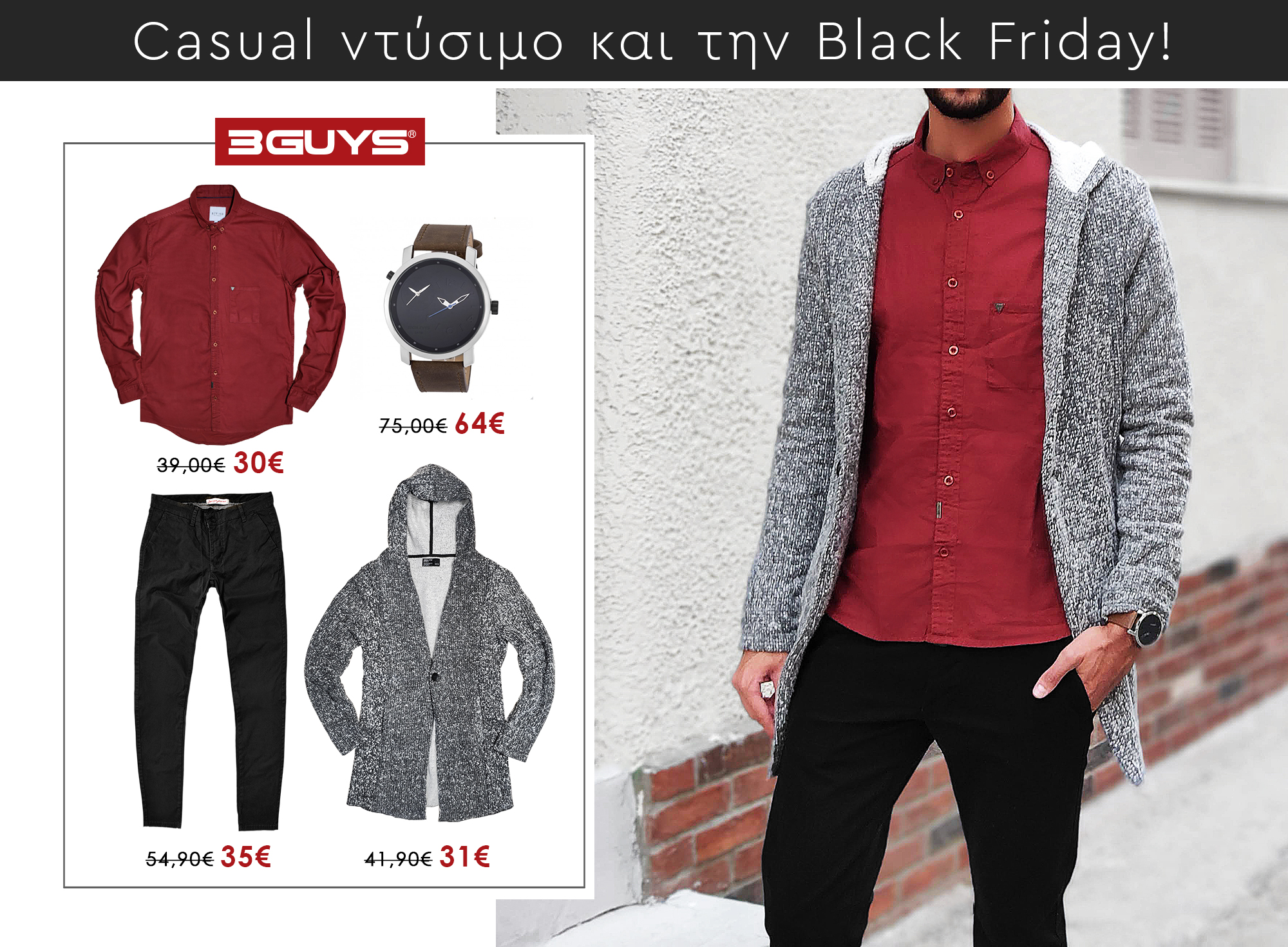 Αν βαρέθηκες να φοράς όλο τα ίδια και τα ίδια, οι 3 GUYS σου έχουν τη λύση για να εντυπωσιάσεις με το ντύσιμο σου, προτείνοντας σου το απόλυτο outfit για τις Κυριακάτικες βόλτες σου. Οι 3GUYS υποδέχονται τη BLACK FRIDAY που θα διαρκέσει από τις 23 μέχρι και τις 26 Νοεμβρίου, προσφέροντας τις καλύτερες τιμές της αγοράς, στη νέα τους συλλογή καθώς και σε outlet προϊόντα με εκπτώσεις που φτάνουν έως και το 75%. Συγκεκριμένα, μπορείς να βρεις πουκάμισα από 15€, παντελόνια από 15€, ζακέτες από 20€ και μπλούζες από 10€.