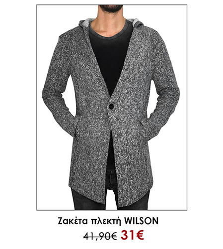 Πλεκτή ζακέταΑνδρική πλεκτή ζακέτα WilsonΟλοκλήρωσε το urban style σου επιλέγοντας μια μακρυά ζακέτα πλεκτή με κουκούλα όπου θα αποτελέσει την πιο must αγορά σου για το φετινό χειμώνα. Η ανδρική πλεκτή ζακέτα WILSON βγαίνει σε μαύρο , γκρι ανοιχτό και σε χακί χρώμα ικανοποιώντας όλα τα γούστα. Μπορείς να τη φορέσεις άνετα με μία μονόχρωμη μπλούζα και οποιοδήποτε τζιν της επιλογής σου. Κάνε το δικό σου με ένα κλικ. |
