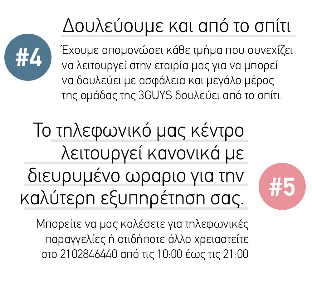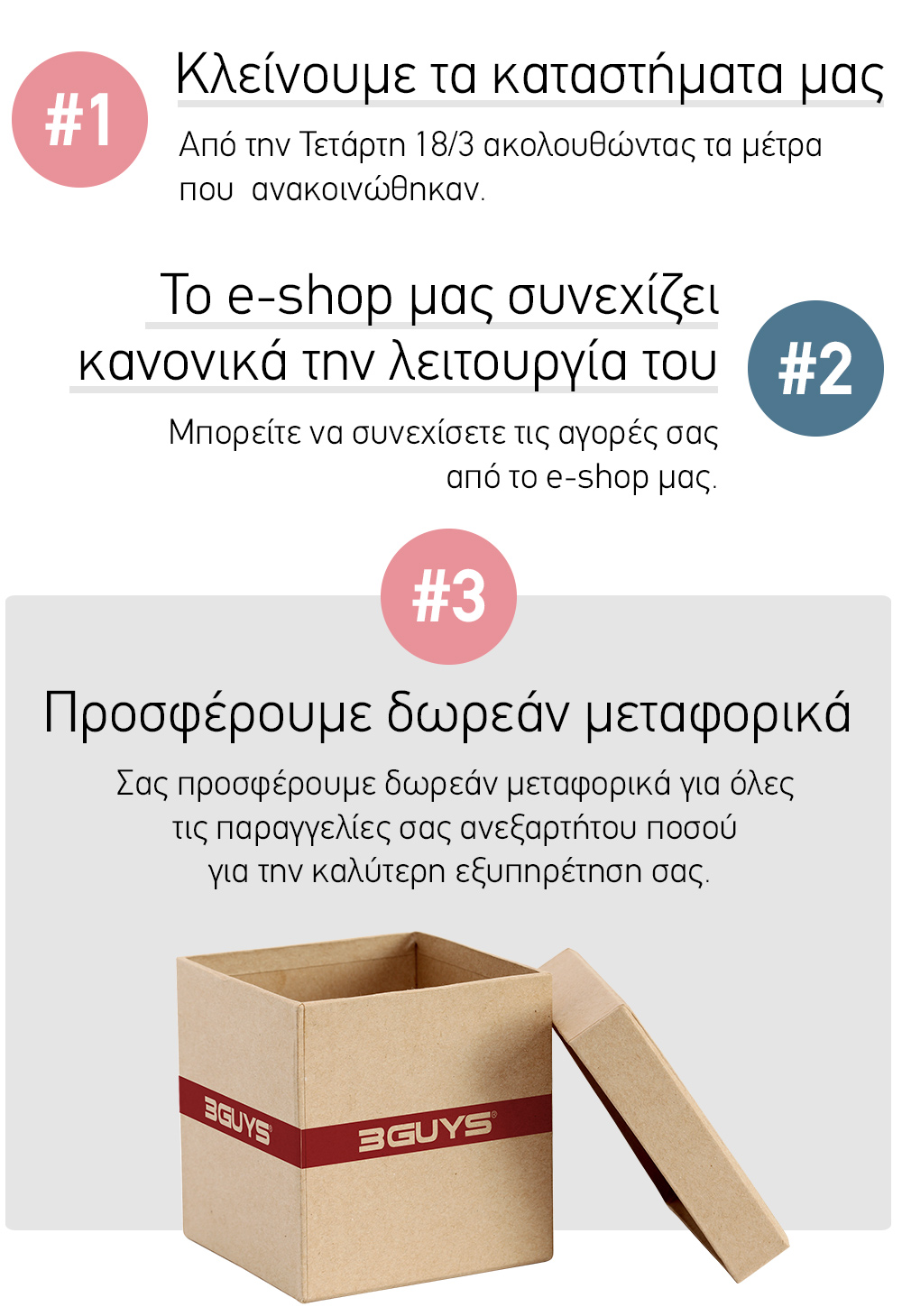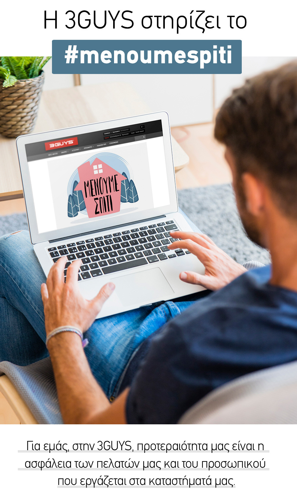 H 3GUYS στηρίζει το #menoumespiti! Τα καταστήματα μας θα παραμείνουν κλειστά από 18/3 μέχρι νεωτέρας γιατί προτεραιότητα μας είναι η ασφάλεια των πελατών μας καιτου προσωπικού μας.Κατά την διάρκεια αναστολής της λειτουργίας των φυσικών καταστημάτων μας για να μπορείτε να συνεχίσετε τις αγορές σας θα έχετε την δυνατότηταεξυπηρέτησης μέσω του ηλεκτρονικού καταστήματός μας 3guys.gr και σας προσφέρουμε δωρεάν μεταφορικά για όλες τις παραγγελίες σας ανεξαρτήτου ποσού για την καλύτερη εξυπηρέτηση σας.Για τηλεφωνικές παραγγελίες ή οτιδήποτε άλλο χρειαστείτε η εξυπηρέτηση πελατών μας είναι διαθέσιμη στο 2102846440 από τις 10:00 έως τις 21:00 καθημερινά.#3guys #menoumespiti #besafe