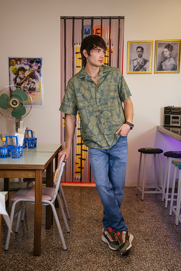 TAILANDI street food, το σκηνικό του φωτογραφικού editorial, ενισχύει το κλίμα: νέον φώτα, ρετρό διακόσμηση και τηλεοράσεις των 90s. Ένα περιβάλλον που γεφυρώνει την αυθεντική ασιατική κουλτούρα με το streetwear του σήμερα, τονίζοντας το πολυπολιτισμικό ύφος των ρούχων.